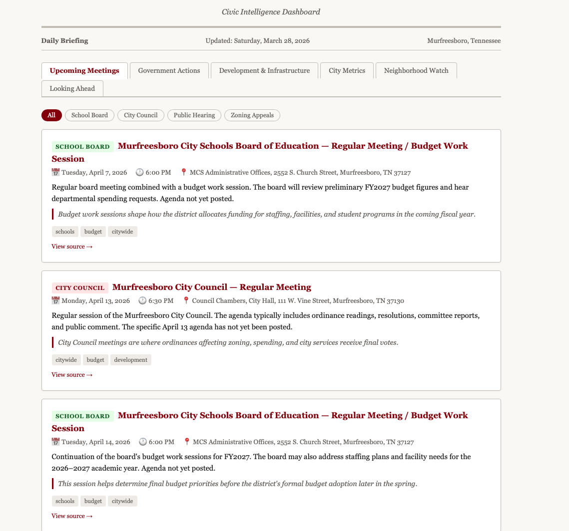 Get direct access to Murfreesboro’s most important civic data—without the noise. The Civic Intelligence Dashboard delivers a structured, continuously updated view of local government activity, development projects, and key city metrics. Built from public records and primary sources, this tool helps you understand what’s happening, what’s changing, and what’s coming next. Designed for residents, business owners, and professionals who want clarity—not headlines.